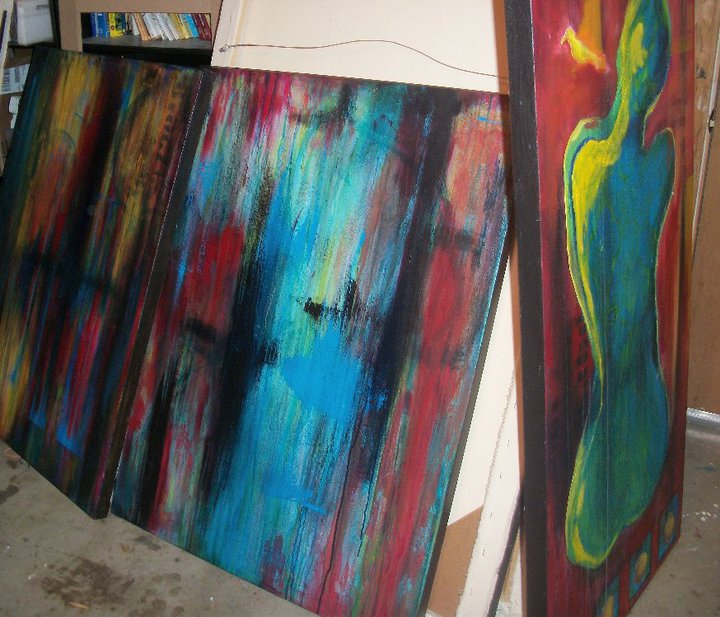 Here’s a photo of some ‘works-in-progress’ that I posted on my Facebook page back in July. I had been having fun layering paint, spraying the wet paint and watching it run. I didn’t really know where I was going with these paintings, but I like to work on top of a layered background anyway, so at least I had a starting point.